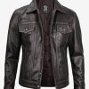 Look at the men’s dark brown leather trucker jacket. Its traditional design features useful pockets and is made of supple lambskin leather. This jacket is ideal for everyday use, bringing a touch of casual flair to your outfit. Perfect for any event.