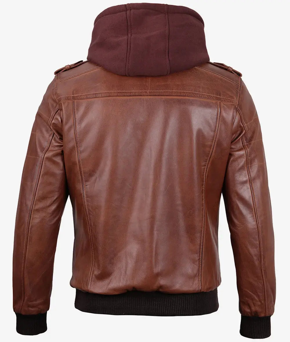 Men’s Brown Leather Bomber Jacket With Removable Hood