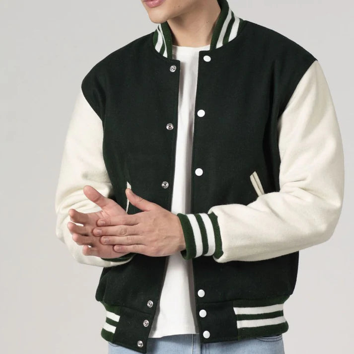 The Dartmouth Green & White Customisable All-Wool Varsity Jacket is both classic and modern, thanks to its personalised touch. Â Crafted from high-quality wool in Dartmouth’s traditional green and white colours, this jacket seamlessly blends tradition with personalised alternatives. Â It is ideal for creating a stylish statement or exhibiting school passion and can be worn for any occasion, from special events to everyday wear.