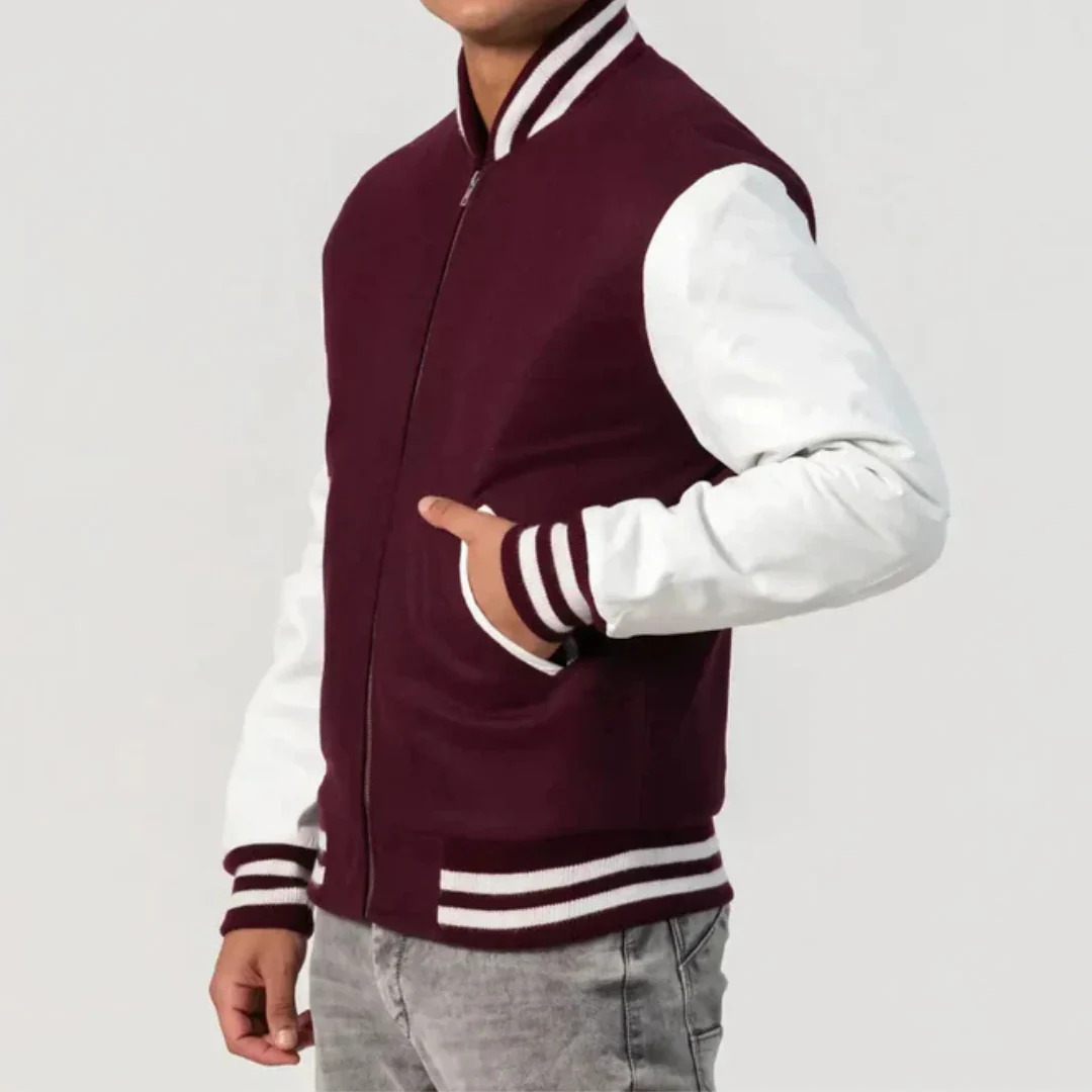 Maroon Wool Varsity Jacket with White Leather Sleeves and Zipper