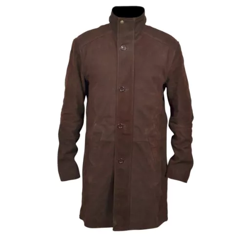 The Longmire Long Brown Leather Coat, modelled after Sheriff Walt Longmire from the hit criminal drama series, exudes rustic ranch style. It is made of smooth nubuck leather in a chestnut brown colour and develops character with usage. The coat has a faux fur collar, two handwarmer pockets and a double closing system—first with a zipper, then with button closures. Its tough shape evokes the utility of ranch-hand coats seen in Colorado, New Mexico, and Arizona. This long leather coat is both utilitarian and fashionable, ideal for fans of the show or anyone looking for a classic western look.