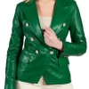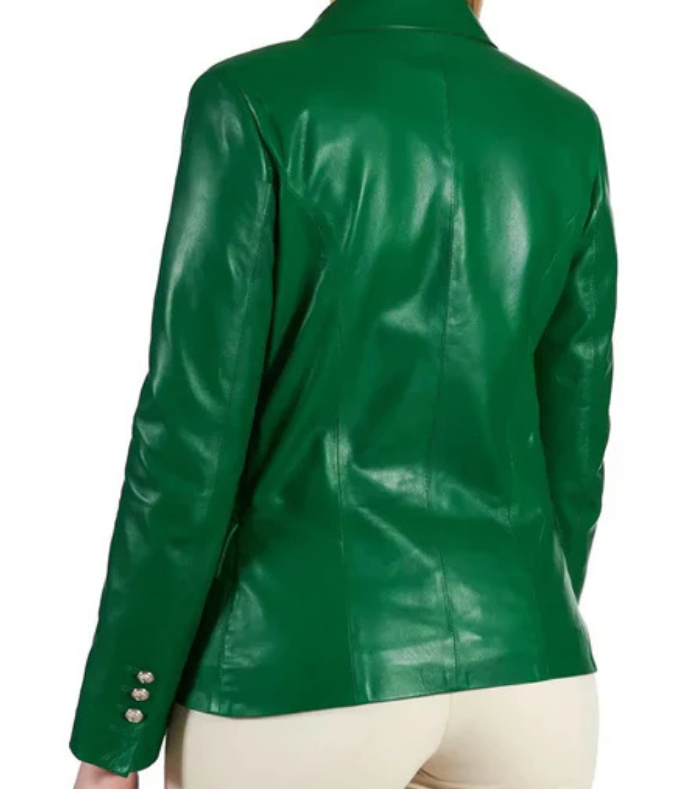 Without a doubt, this women’s green breasted leather coat will turn heads. Â This gorgeous green coat is constructed of high-quality leather and features a double-breasted design for enhanced sophistication. Â Its fitted shape, efficient pockets, and streamlined design combine style and functionality, making it an essential addition to any modern wardrobe. Â Ideal for giving any outfit a distinctive and appealing touch.