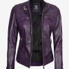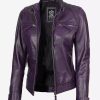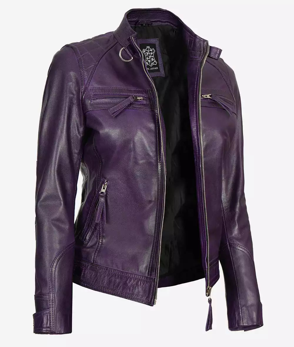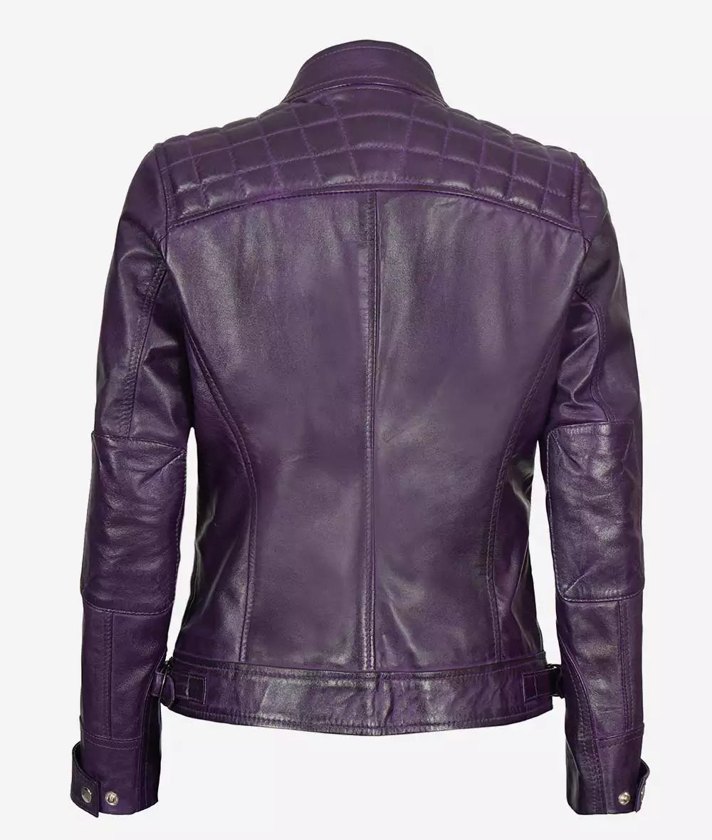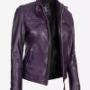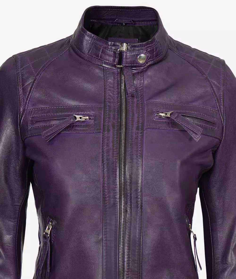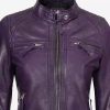 Women’s Purple Cafe Racer Leather Jacket With Quilted Shoulder