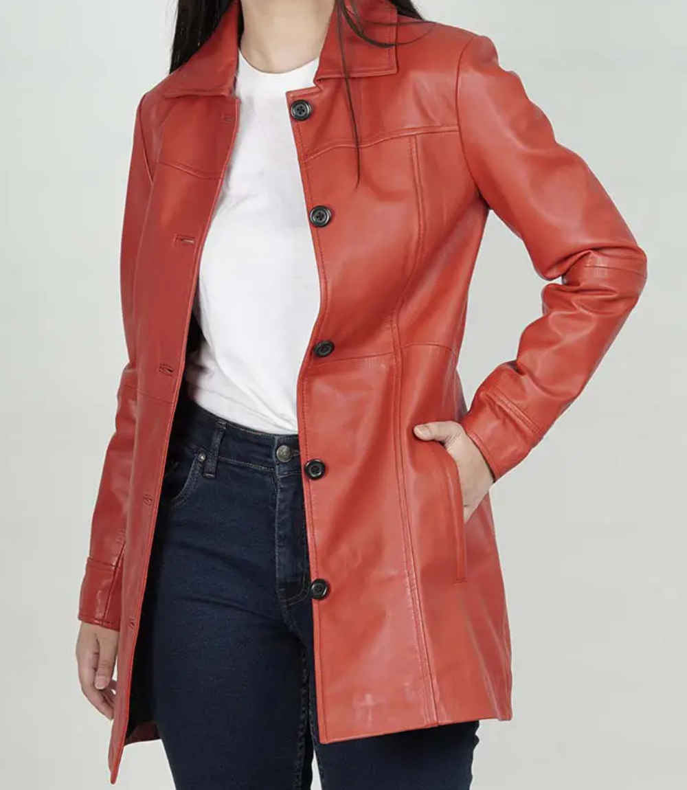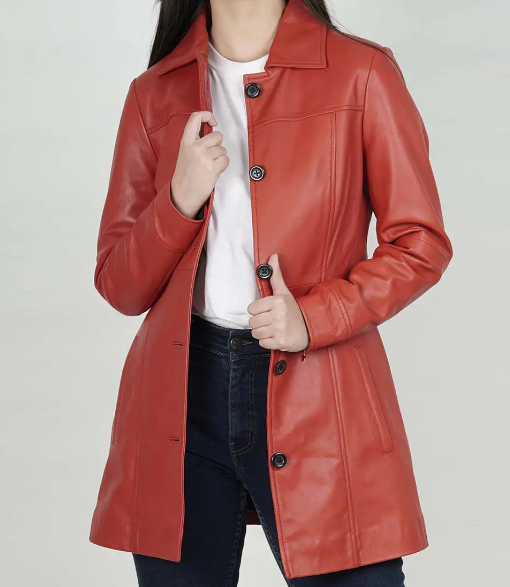 Every modern woman’s wardrobe must include the classic red coat. This leather coat’s skin-friendly lining, minimalist button closure, and traditional shirt-style collar add sophistication to any event. It’s ideal for the season, combining elegance and comfort in a vibrant red colour.