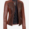 The brand-new Women’s Textured Brown Leather Cafe Racer Jacket will help you commute in elegance. It is composed of high-quality authentic lambskin leather and features a plush polyester lining. Other features include an upright collar, zip closure, two exterior pockets, and one inside pocket for storing your essentials.
